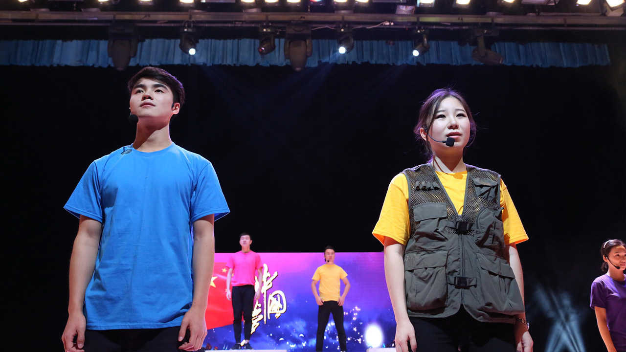 开学典礼仪式结束后,校领导和全体新生共同观看了大学生艺术团表演的音乐短剧《战地蔷薇》。这部音乐剧的创作灵感来自于我校东方语学院阿语系2009届校友王薇薇的真实经历。她作为中央电视台战地记者,在硝烟弥漫、战火纷飞的的叙利亚街头进行新闻报道的事迹曾在网络引起热议。这部音乐短剧所表现的“让每个青年都有梦想,让每个青春都能绽放”的主题,正是对于“青年梦”、“中国梦”的叩问与思考,也提示了在座新生“大学之道 青春之路”的行走方式。为了这次演出,已经毕业的校友艾力迪亚·阿尔斯郎、沈道灵特地远道而来,和其他在校演员共同为2016级新生献上了一场精彩的演出。演出尾声,伴着校歌的激昂歌声,由校棒球队学生组成的旗队将舞台装点成旗帜的海洋,舞动的国旗与校旗将全场的气氛推向了高潮。