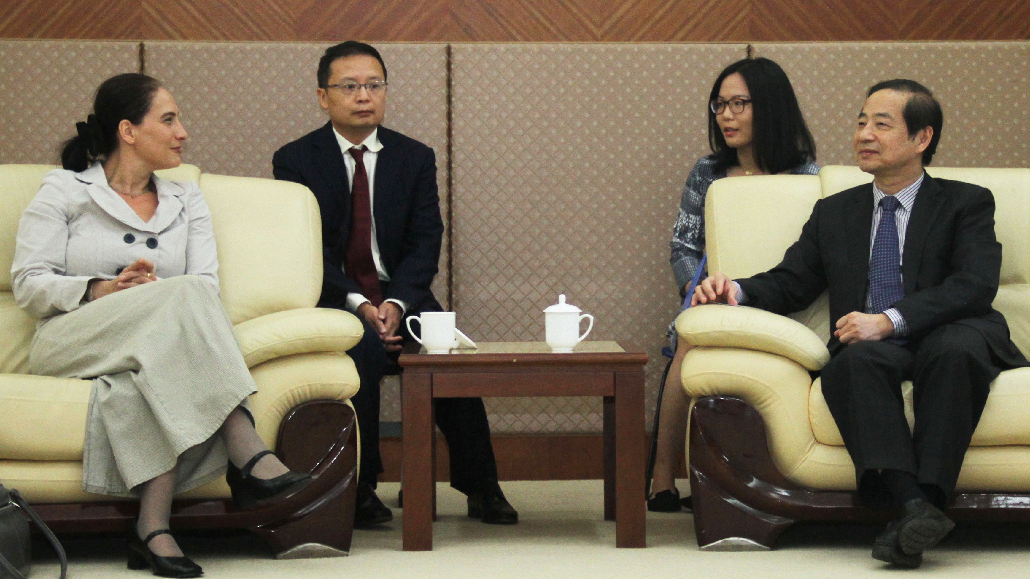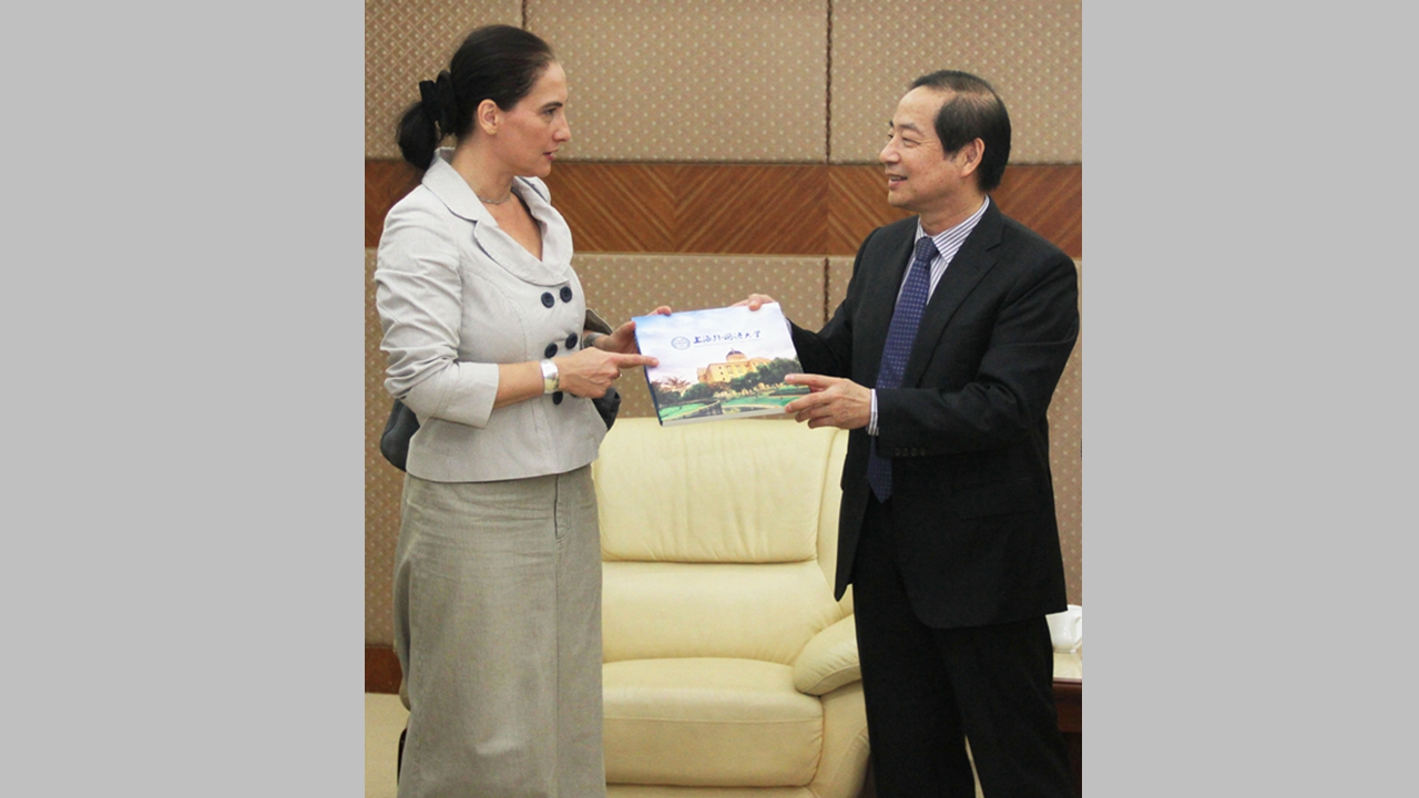 开幕式前,曹德明校长在图文中心贵宾厅会见了匈牙利来宾一行,并与朱迪·哈默施泰因就两国教育合作等问题进行了深入交流。曹德明介绍了上外的办学历史、学科特色及国际交流情况,他指出,随着“一带一路”建设的推进,上外将针对沿线国家开设相关的语言专业,加强相关的区域国别研究。