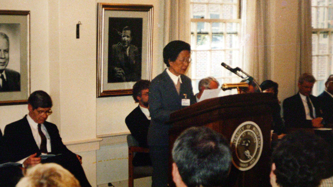 1993年4月30日,李观仪在美国蒙大拿大学建校一百周年仪式上代表上海外国语大学致贺词。 【摄影 | 】