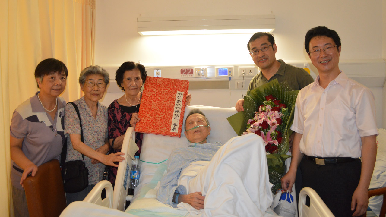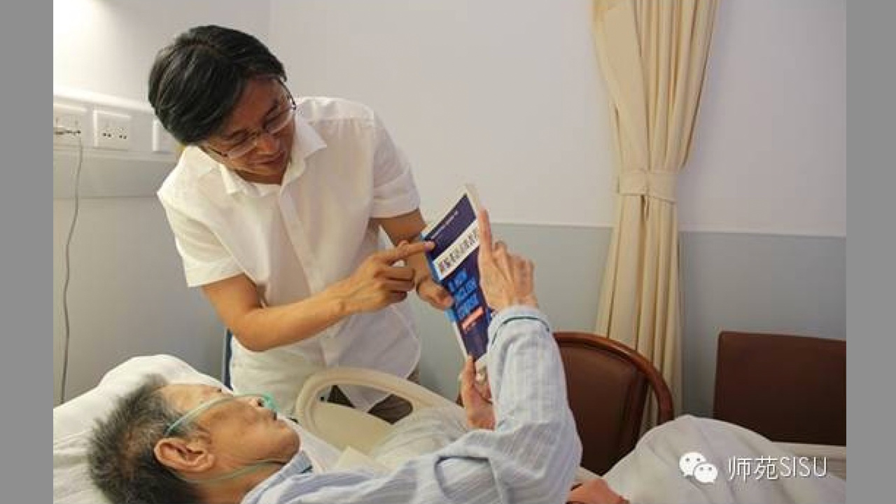 2014年教师节,校党委书记姜锋看望李观仪先生,在病榻前聊起最新改版的《新编英语教程》。 【摄影 | 】