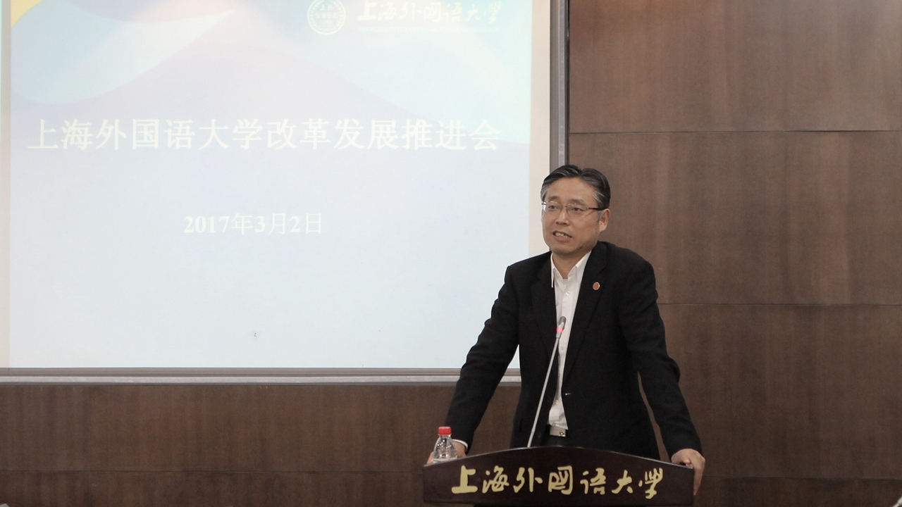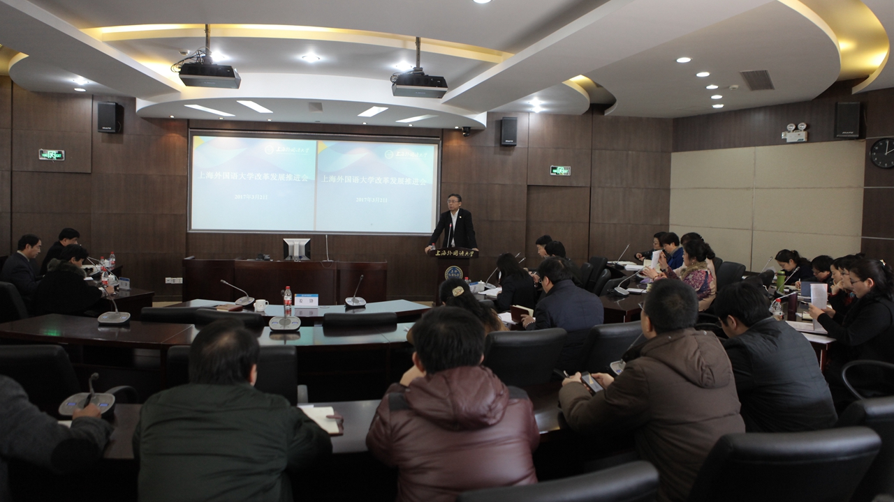 2017年3月2日至3日,上海外国语大学召开改革发展推进会。党委书记姜锋做动员报告,校长曹德明做总结报告。会议由副校长冯庆华主持。校领导王静、钱玲、杨力、周承、林学雷等出席会议。