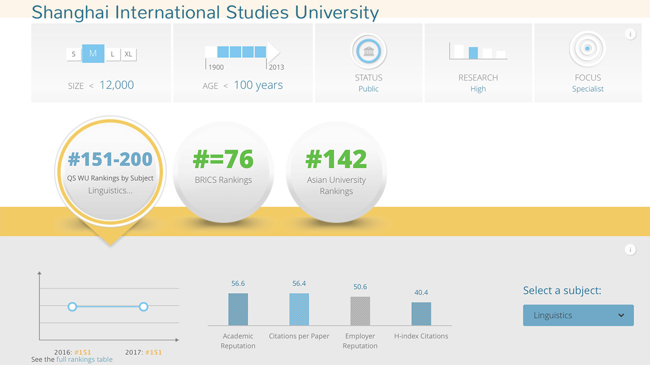 值得一提的是,在QS历年发布的榜单中,上海外国语大学另有两项排名值得关注,其中在2016年亚洲大学排名中跻身第142位,在2016年金砖五国大学排名中列76位,两项排名均在中国大陆高校中列第34,位居中国语言类高校首位。