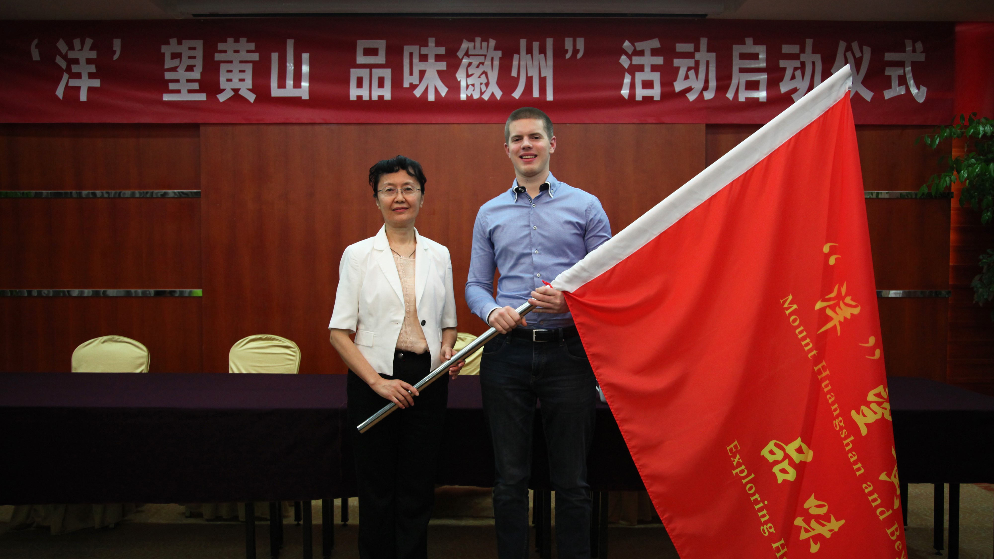 最后,黄山市委常委、宣传部部长路海燕向上外学子代表、德国留学生卢卡斯授旗。