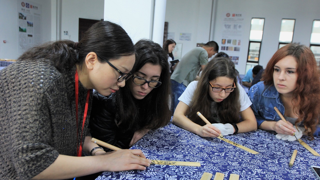 来自“一带一路”沿线国家的留学生动手体验徽州竹雕(《人民日报》2017年5月18日)