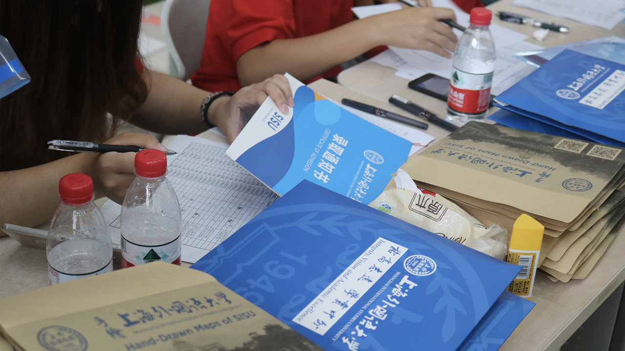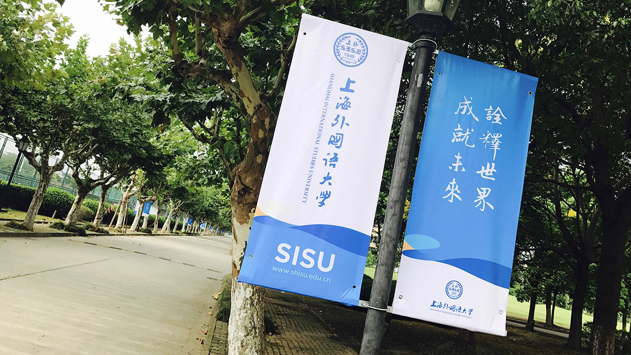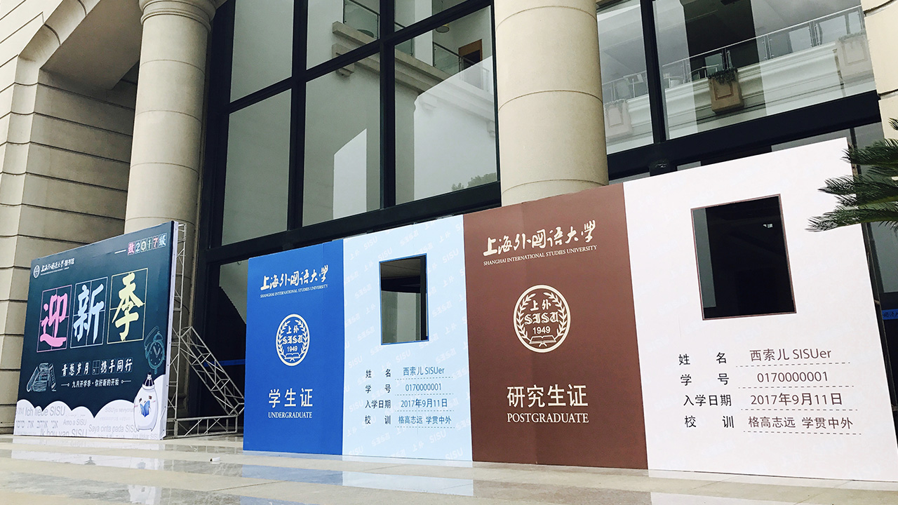 校园主干道两侧印有中英双语校训和办学理念的道旗,用上外蓝的独特视觉形象,迎接 2017 级新生们的到来。“Embark on a New Journey @ SISU”是本次上外迎新季的标语,寄托着对每一位即将在上外校园书写未来的西索儿(SISUer)的美好祝愿。