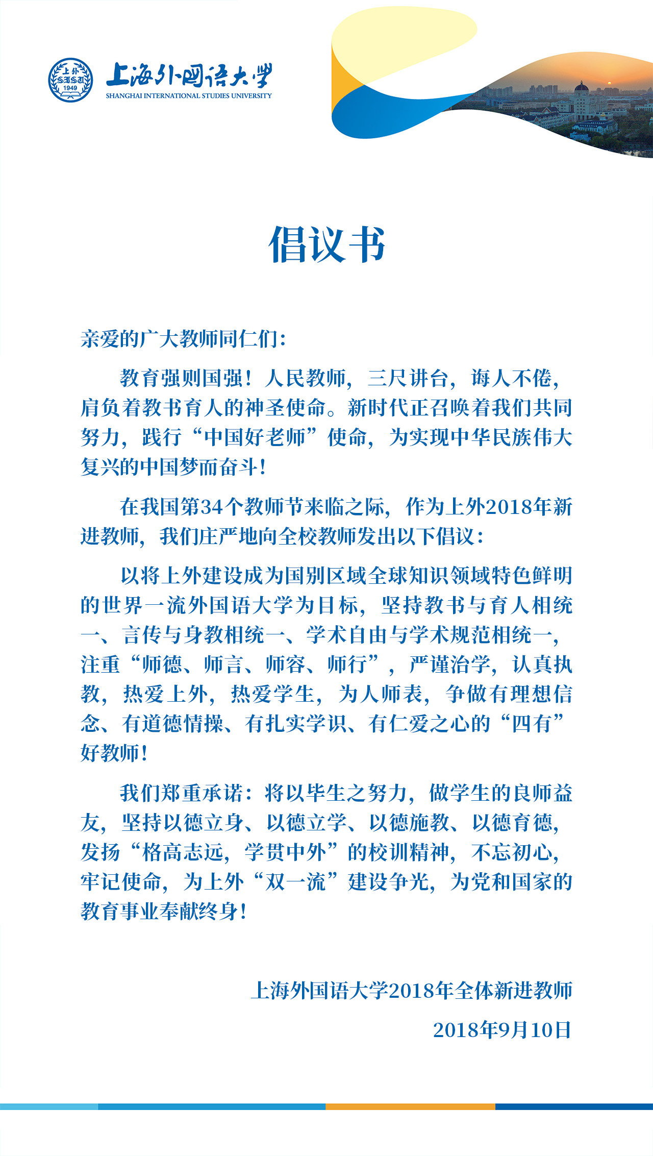 上海外国语大学2018年全体新进教师:倡议书