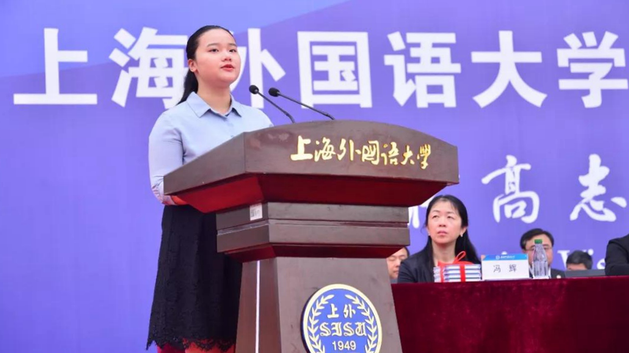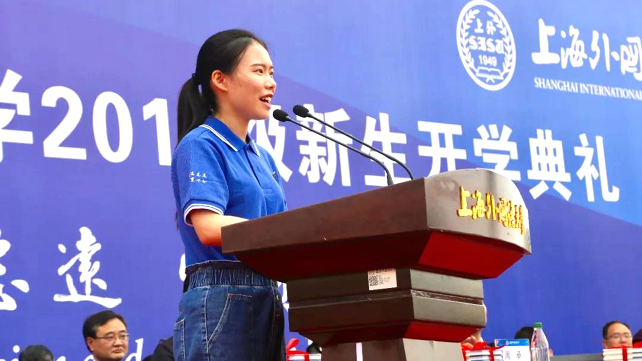 2018级东方语学院阿拉伯语语言文学专业硕士研究生黄瑜珊作为新生代表发言,她通过讲述自己亲历的两个小故事和新同学们分享了选择上外的原因,并表示作为外语人,在跨文化交际中,不仅代表自己,更代表着国家形象,应怀着兼济天下的理想,响应“命运共同体”号召,以萤烛之光温暖世界。