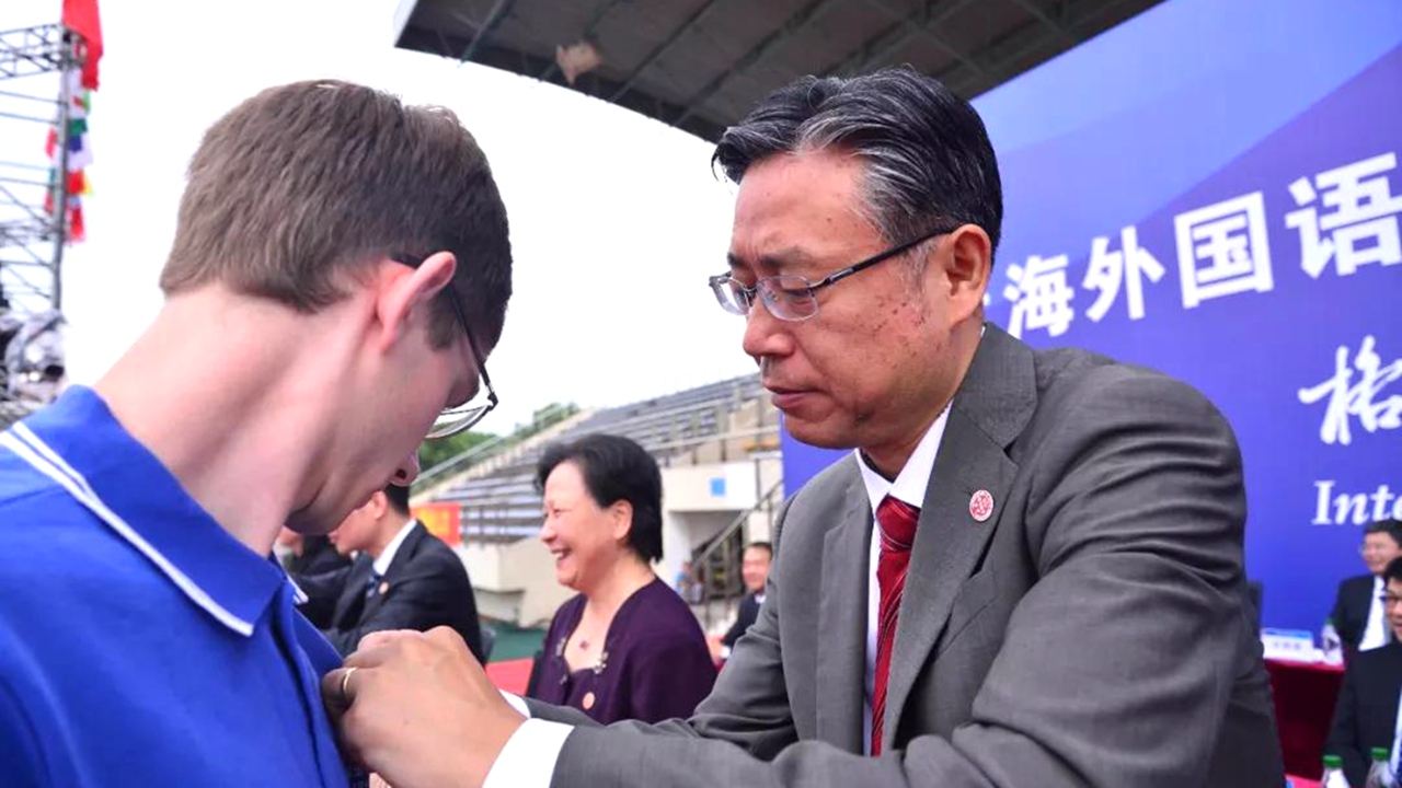 校长李岩松为2018级新生佩戴校徽 【摄影 | 】