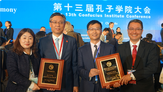 在闭幕式上,上海外国语大学党委书记姜锋接受教育部副部长、孔子学院总部理事会常务理事田学军颁发的“孔子学院先进中方合作机构”荣誉。这是上海外国语大学继2014年、2015年后,第三次获得此项殊荣。上外合作共建的秘鲁天主教大学孔子学院荣获“先进孔子学院”称号。上外孔院工作处处长张雪梅及上外孔院工作人员一同参加了此次孔子学院大会。