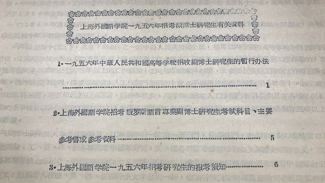 其中,较有代表性的珍贵文件有《上海外国语学院一九五六年招考副博士研究生有关资料》,文中详细记录上外1956年招考首批俄罗斯语言专业副博士研究生的报考信息、考试科目和主要参考资料,直观反映出当年中国参照苏联的学历管理模式培养研究生的众多史实。