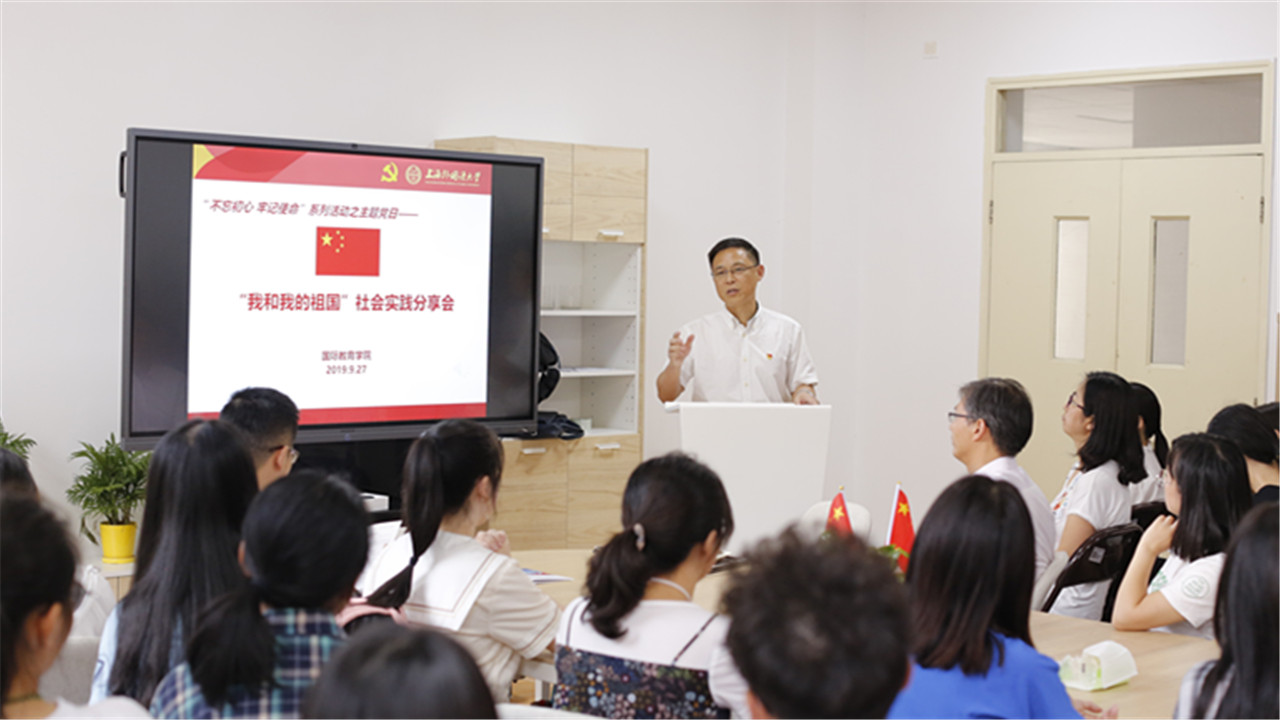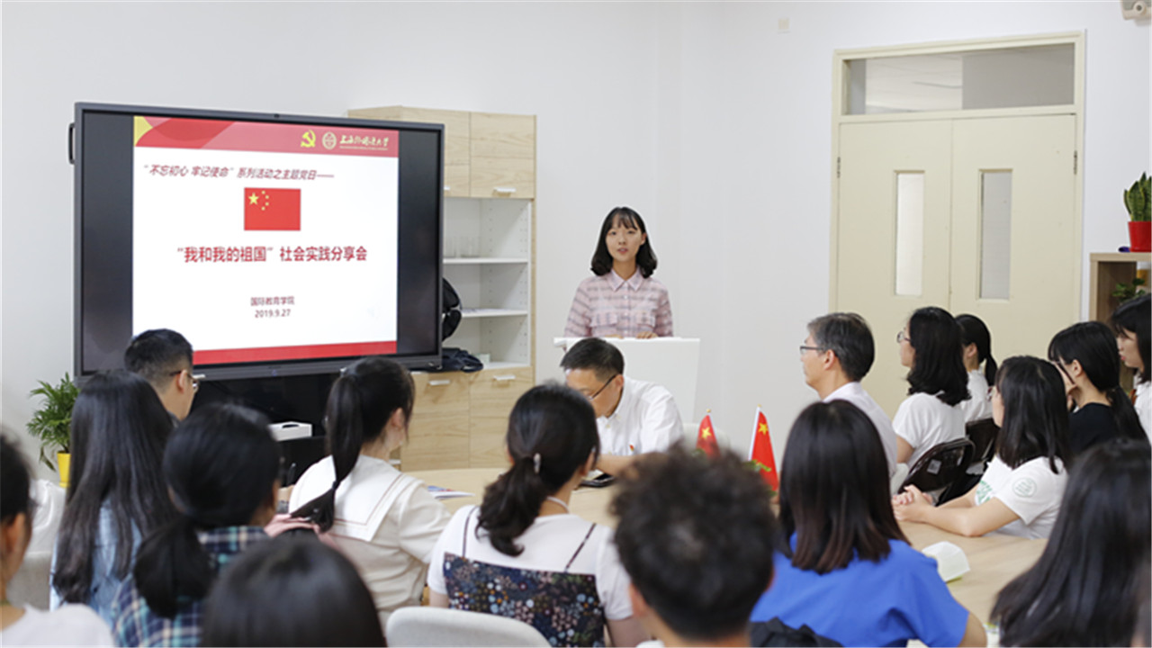 9月29日,在全校开展“不忘初心 牢记使命”主题教育活动之际,国际教育学院教工党支部和学生党支部联合举办了一次主题党日活动,本次活动主题为“我和我的祖国”,邀请国际教育学院暑期社会实践团队进行成果分享,教师党员和学生党员聆听分享并进行互动交流。