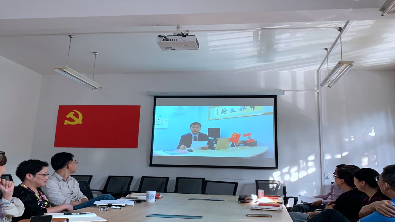 学院两名身在海外孔子学院工作的党员黄皓老师和彭梅老师通过视频向大家介绍了他们在海外的工作情况,表达了他们对祖国浓浓的思念和祝福。