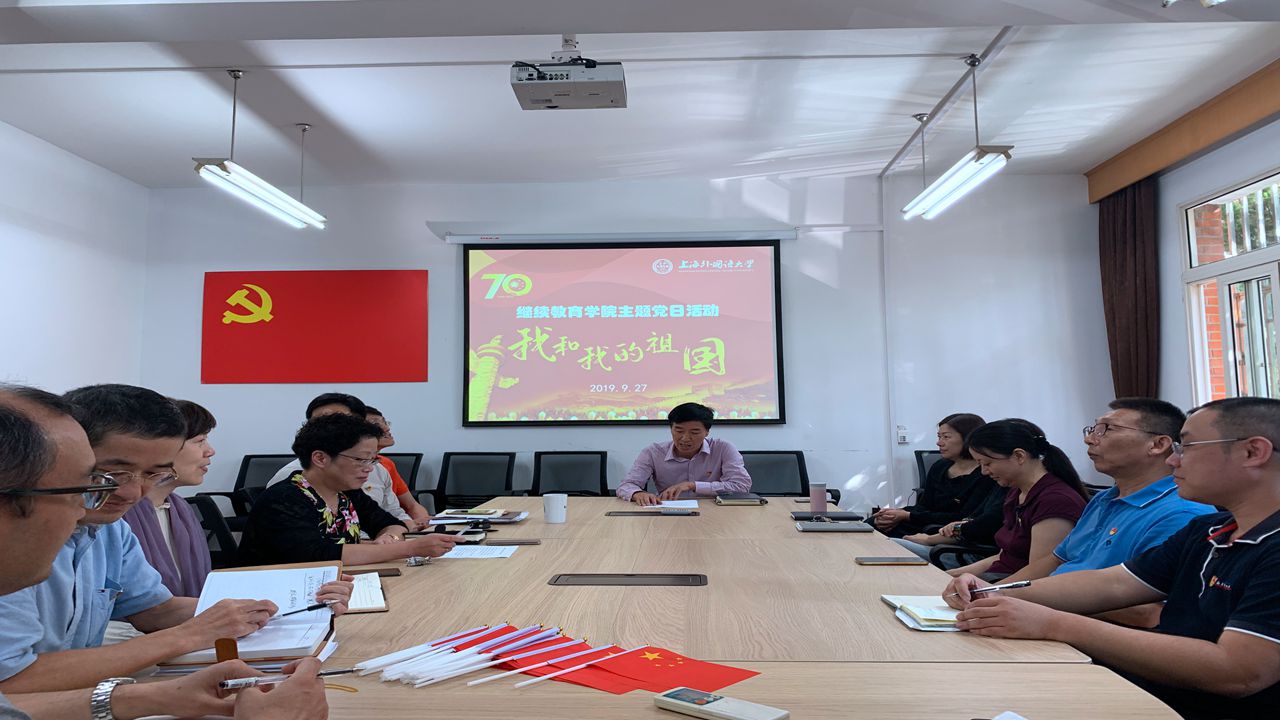 为隆重庆祝中华人民共和国建国七十周年和上海外国语大学建校七十周年,大力弘扬爱国主义精神,深入开展“不忘初心、牢记使命”主题教育,激发全院师生爱国、爱党、荣校热情,继续教育学院党总支于9月27日举办“我和我的祖国”主题党日活动。本次活动由学院党总支副书记陈建培主持,全院师生党员参加了活动。