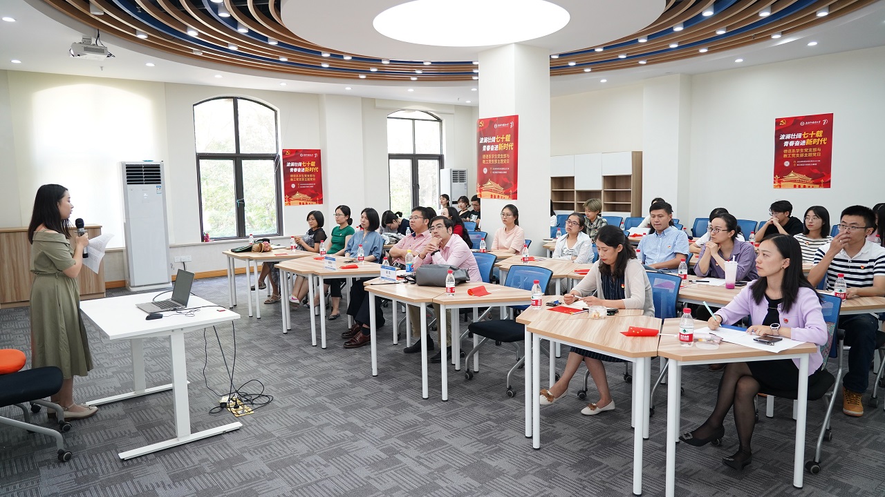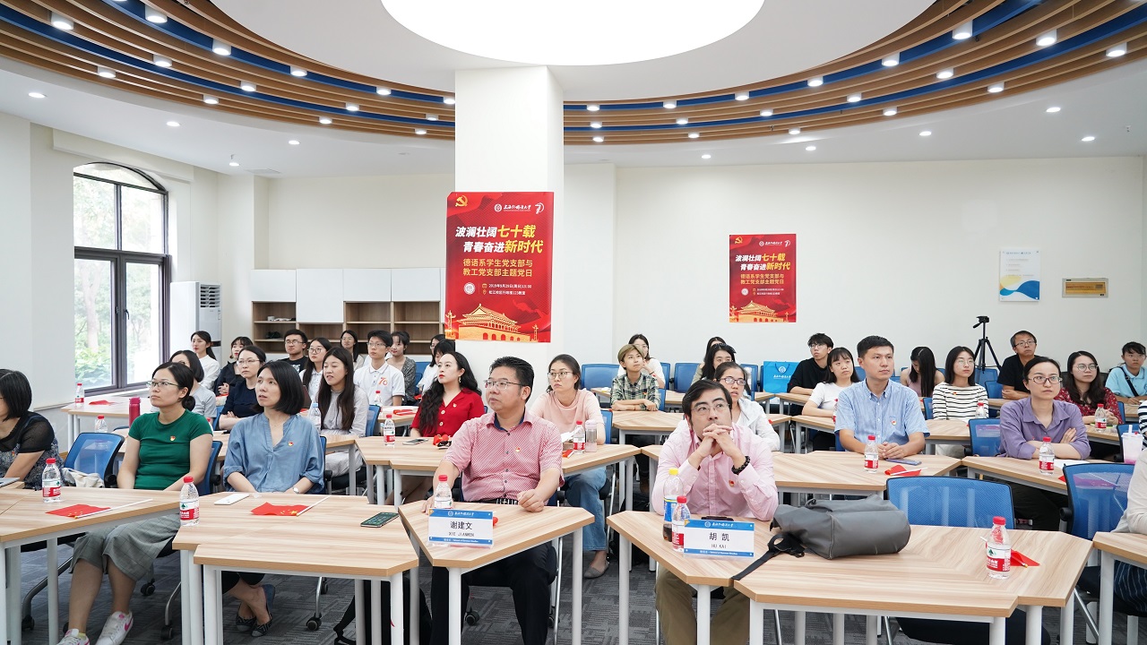 9月29日下午,上海外国语大学德语系在松江校区行政楼123教室开展“波澜壮阔七十载,青春奋进新时代”教工党支部与学生党支部联合主题党日活动。德语系党总支书记谢建文、系副主任、教工党支部书记胡凯、党总支副书记田力娜、党总支纪检委员刘健、专职组织员秦韶云、全体教师党员和本硕博学生党员参加了活动。活动由党总支副书记田力娜主持。