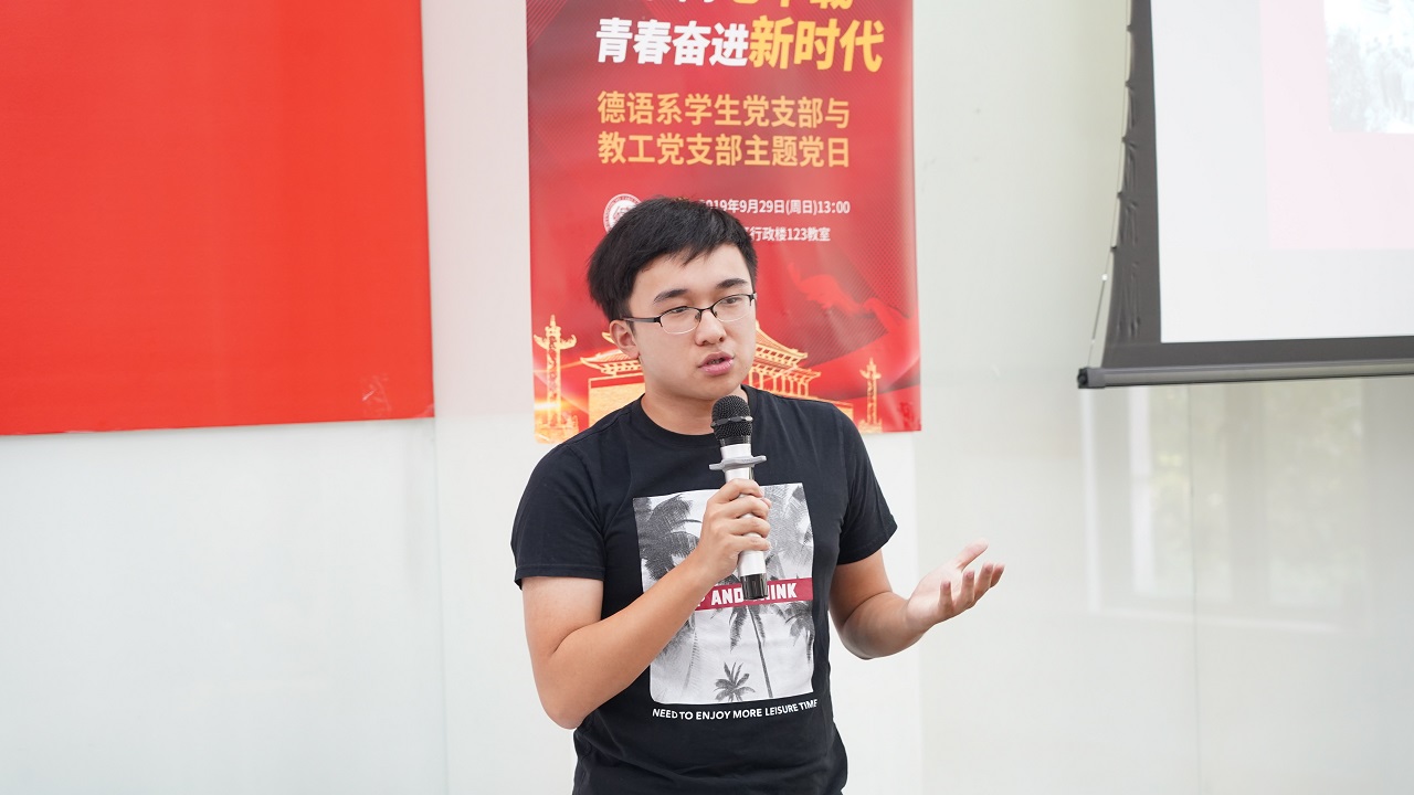 德语系党总支书记谢建文在总结讲话中谈到,这次主题党日活动是对党的建设、对祖国发展的认识、分享与思考,同学们和老师们的分享深入、深情、生动,希望大家继续保持实干的精神,每个人立足各自的岗位与角色,向祖国交出最满意的答卷。不忘初心,牢记使命;诠释世界,成就未来。