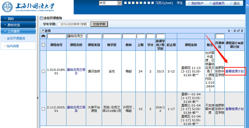 2.全校开设课程在教务系统均已公布,学生可通过教务系统的“公共服务”—“全校开课查询”栏,根据自己需要的字段输入搜索,查询所有课程。自第3教学周开始,可在该栏目查询课程的授课计划和授课信息;