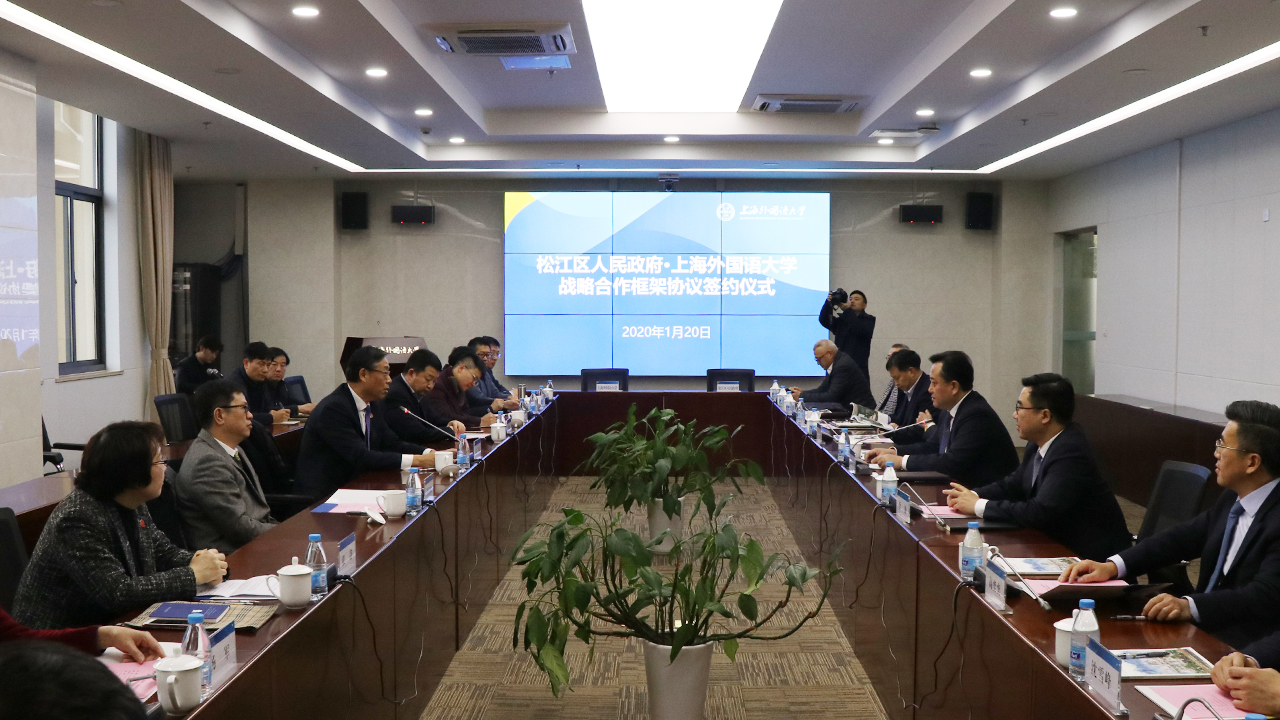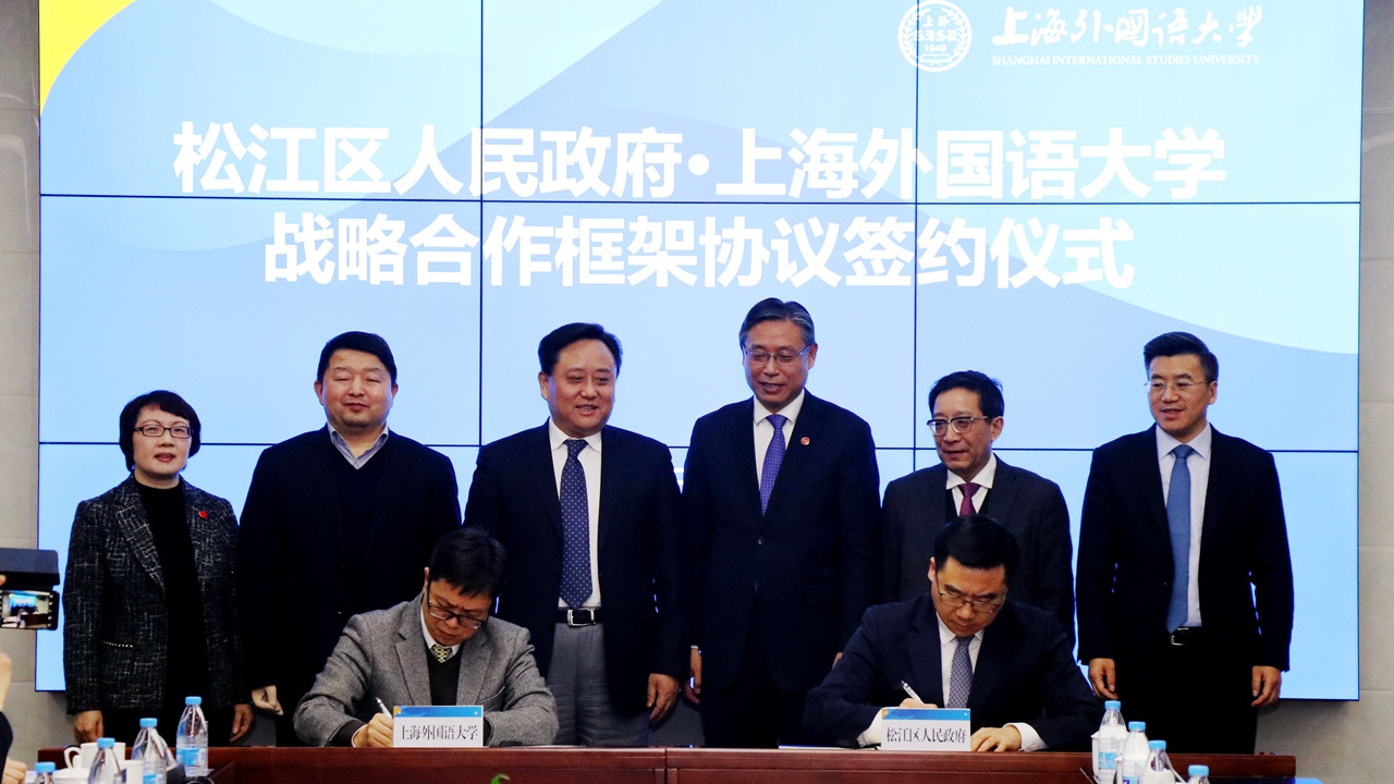 1月20日下午,上海外国语大学与松江区举行战略合作框架协议签约仪式。松江区区委书记程向民,上外党委书记姜锋致辞。松江区区委副书记、区长李谦,上外党委副书记、校长李岩松,松江区区委常委、副区长于宁、高奕奕,上外党委常委、副校长林学雷、张静等出席。