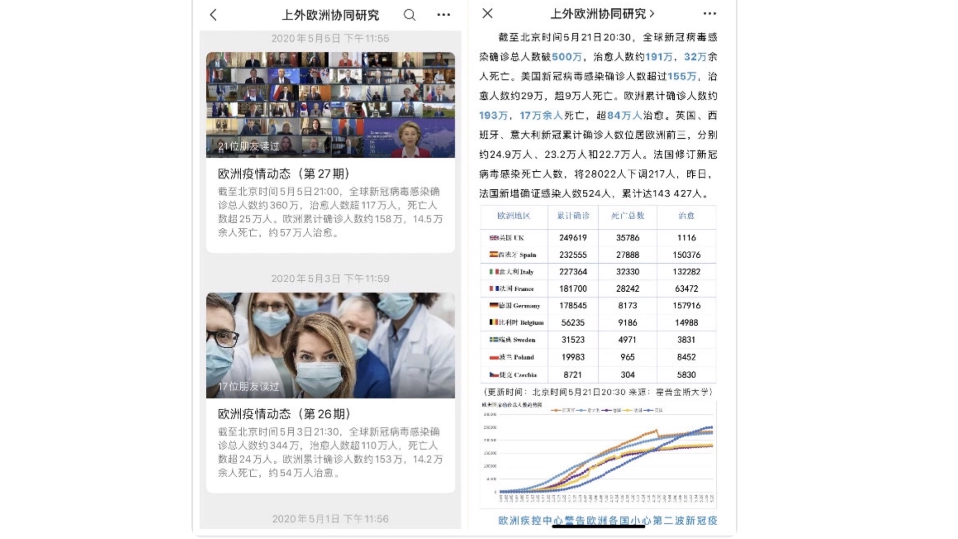 3月初,欧洲疫情开始蔓延。自3月14日起,“上外欧洲协同研究”公众号发布《独家:欧洲各国疫情最新动态》,分7条推送分别介绍了德国、法国、英国、意大利、瑞典、匈牙利和西班牙的疫情现状。此后,所有国家信息合并为一条“欧洲疫情动态”,每两日发布,此间不断有新的国家动态加入,截止5月22日,已发布35期(点击阅读最新欧洲疫情动态),每期均逾上万字,总字数超过40万字。