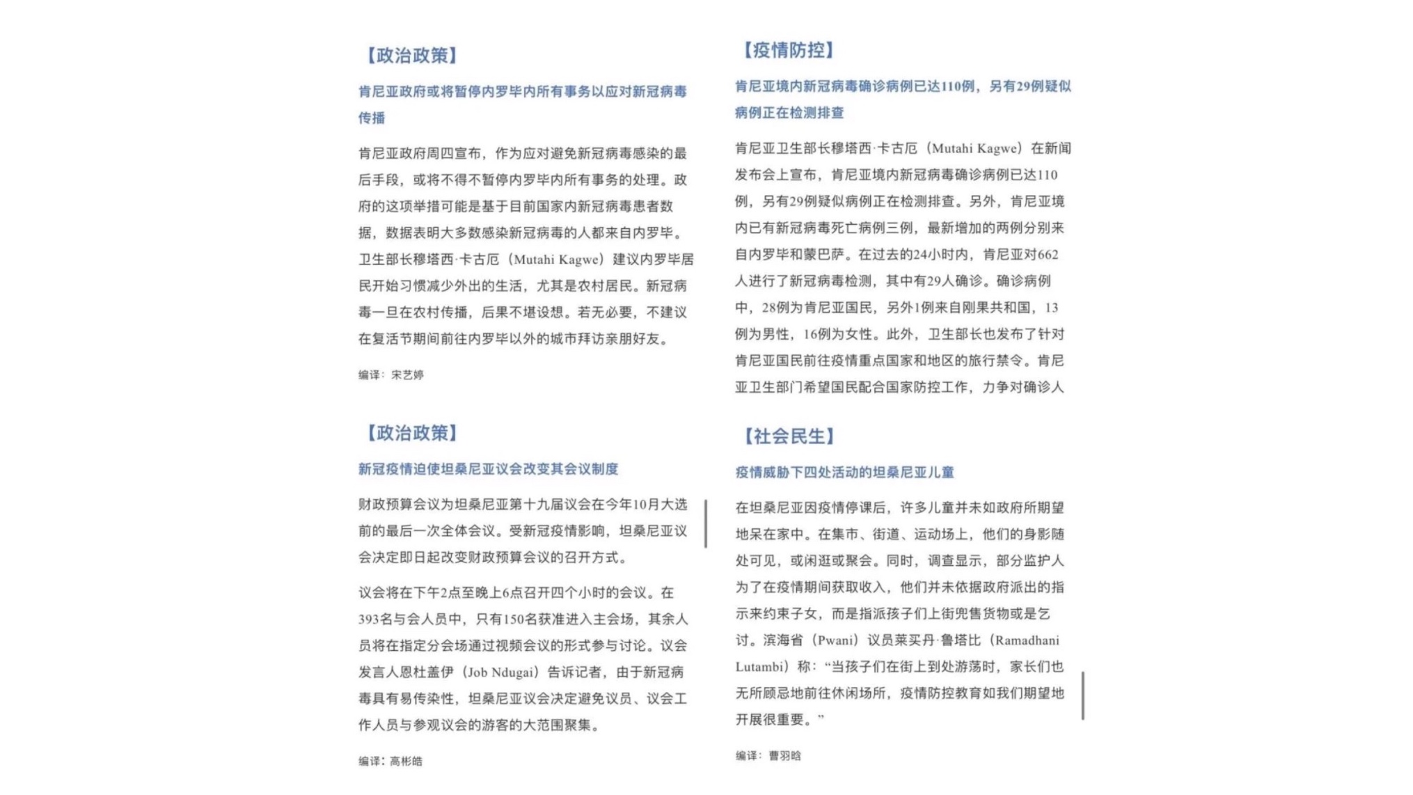 而这个学期,斯瓦希里语班的师生做了一件让他们觉得“更酷”的事——自2020年4月起,这个平均年龄仅为21岁的“后浪”团队,合力编译了一份名为“东非新型冠状病毒疫情动态报道整理”的简报,集中报道坦桑尼亚、肯尼亚、乌干达和卢旺达等东非国家当前的新冠疫情进展和最新动向。近3个月来,已发布12份简报,总字数达12万余字,编译内容涵盖“疫情防控”“政府政策”“社会新闻”“民生动态”等多个领域,为了解东非各国人民在面对新冠疫情这一紧迫的生存课题方面做出的努力提供了一个可视窗口。