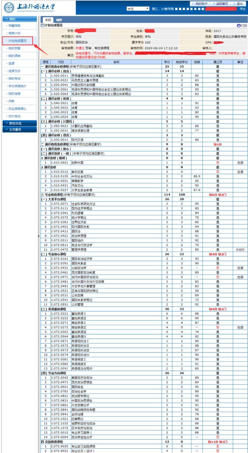 2.选课前和选课过程中,请仔细研究自己的计划完成情况,参照 “我的”—“计划完成情况”如下图: