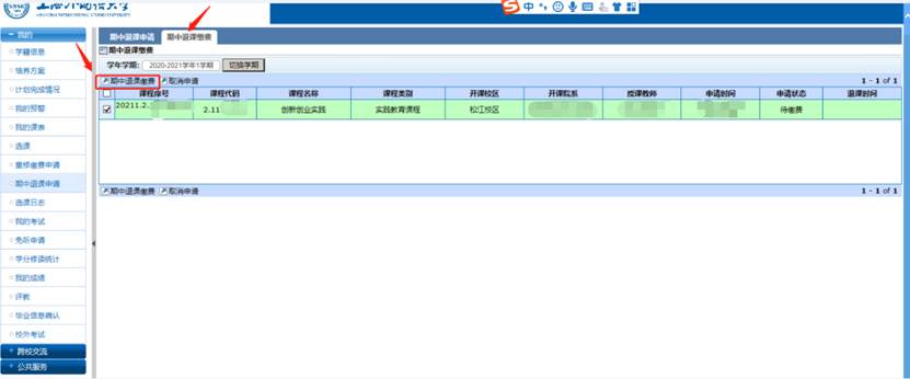 请点击需期中退课课程信息右侧的 “期中退课”按钮完成申请。如下图: