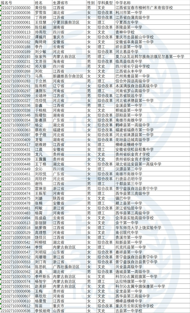 按照教育部有关文件要求,根据《2022年上海外国语大学高校专项计划招生简章》,我校组织专家对符合报名条件并按要求提交的有效报名材料进行严格审核,好中选优,审核结果经学校招生工作领导小组审议,确定了上海外国语大学2022年高校专项计划报名初审合格名单,现予公示: