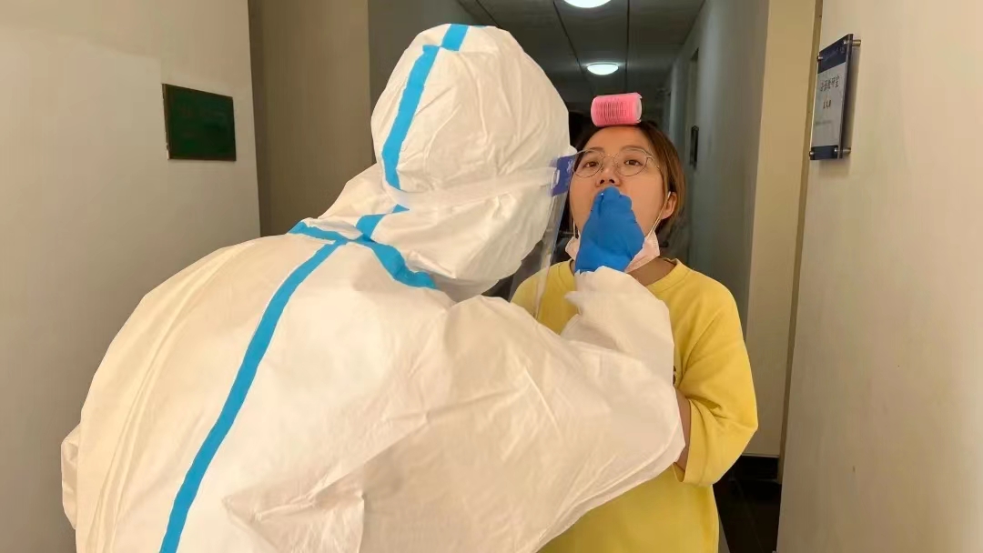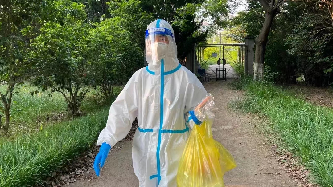 接近30度的天气里,姜医生穿着大白服装带着采样材料奔走在校园各隔离观察点上门采样:教育会堂、教学楼、河东区隔离点等等,有一次天太热,差点中暑。后来,学校为她安排了同样穿大白的保安小哥用巡逻车送她去各个点采样,偌大的校区终于不用依靠双脚去走了,也进一步提升了工作效率。