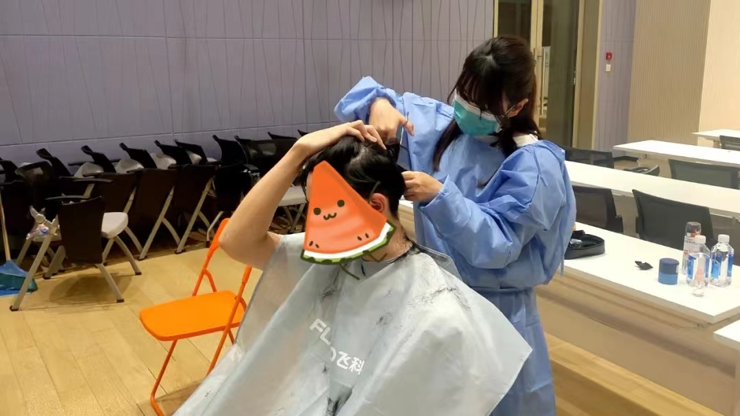 近期,王老师还开发了一项“新技能”——理发。放下对讲机,拿起剪刀和梳子,王老师从零开始学习理发,两周以来已经服务了十几位同学。每次理发,她都拿出“雕花”的细心和耐心,在她的精心打理下,除了基本的剪发和理发,更多的同学还get了满意的新发型。