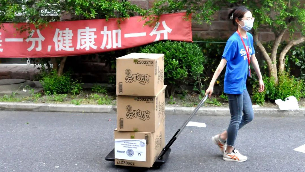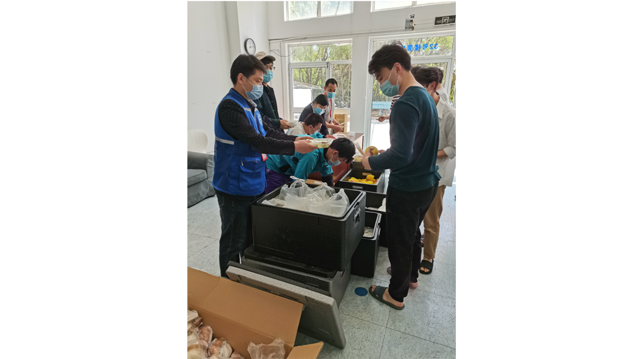 再到后来,这支一个人的搬运队有越来越多的临时队员加入,他们有轮岗休息的保卫小哥、刚忙完手头工作的后勤大叔阿姨、防疫工作组中的志愿者教师、生活区的驻楼老师,只要有时间,大家就主动加入其中一起打包、传送、分发。