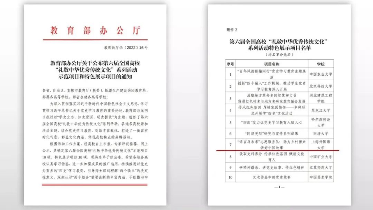 这一年,上外将党的二十大精神融入全球话语实践,多角度对外讲好中国共产党故事,学悟伟大思想,构建中国话语。推出10个语种的“二十大报告多语种对照查询平台”,更好地让海内外深入学习、深刻领会中国共产党的二十大报告及其精神内涵;与《人民日报》合作推出上外师生共同译制的中国共产党国际形象网宣片《CPC》多语种版,在海内外引起热烈反响和广泛关注;与中共一大纪念馆合作,以巡回展车等独特而生动的方式向中外师生诠释“伟大精神铸就伟大时代”;与东方卫视思想政论节目《这就是中国》联合打造党的二十大专题节目,学者师生纵论“自信的中国精神力量和话语力量”;组织学生参与 China Daily 少年会客厅二十大专题节目录制和微纪录片拍摄,立体展现党的二十大精神学思践悟的青年视角。