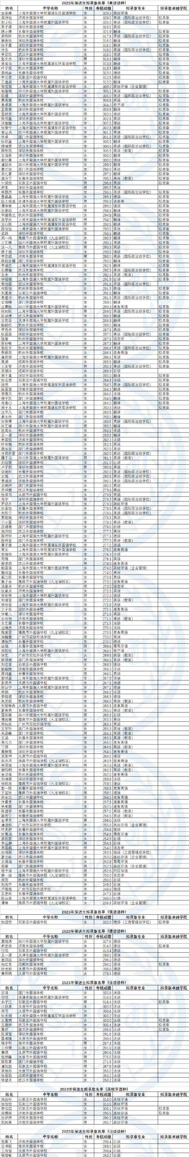 根据《2023年上海外国语大学保送生招生简章》,我校依据考生综合考核总成绩,不分文理科类或选考科目,分考试语种择优录取,2023年保送生拟录取名单经学校招生工作领导小组审定,现予公示: