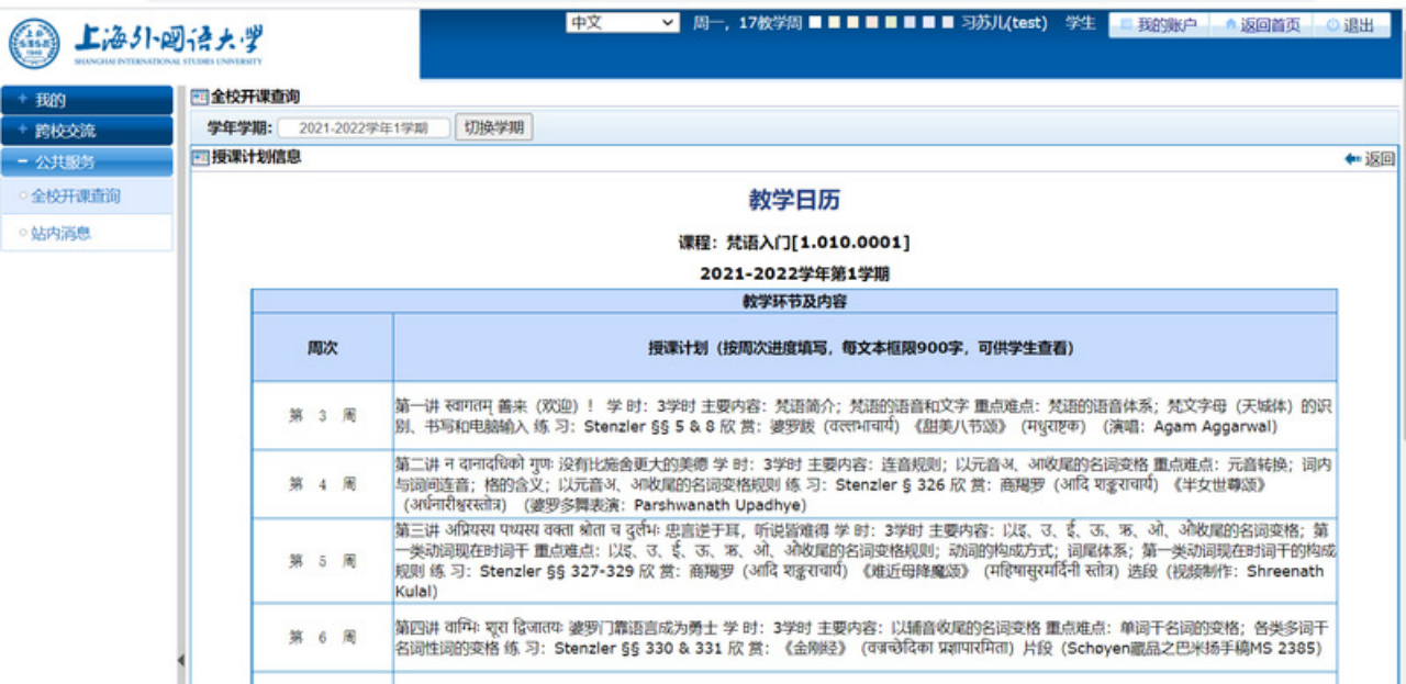 (二)全校开设课程均可公开查询。同学们可通过教务系统的“公共服务”—“全校开课查询”栏,根据自己需要的信息输入关键字搜索查询,参考如下例图(可自第3教学周开始在该栏目查询课程的授课计划和授课信息):