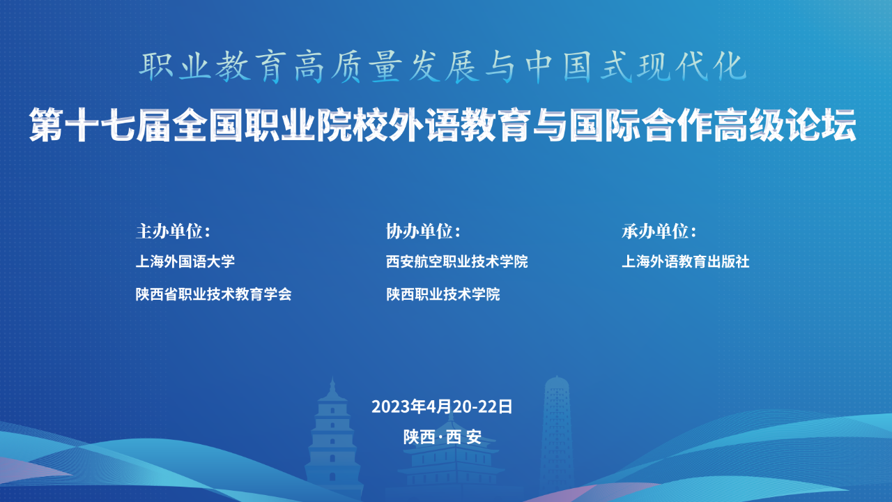 4月21日,在阳光明媚的四月天里,来自全国各地职业院校的专家和老师相聚在古城西安,参加由上海外国语大学、陕西省职业技术教育学会共同主办,西安航空职业技术学院、陕西职业技术学院协办,上海外语教育出版社承办的“第十七届全国职业院校外语教育与国际合作高级论坛”,共商职业教育高质量发展大计,为高职教育发展注入新智慧、新动能、新活力。
