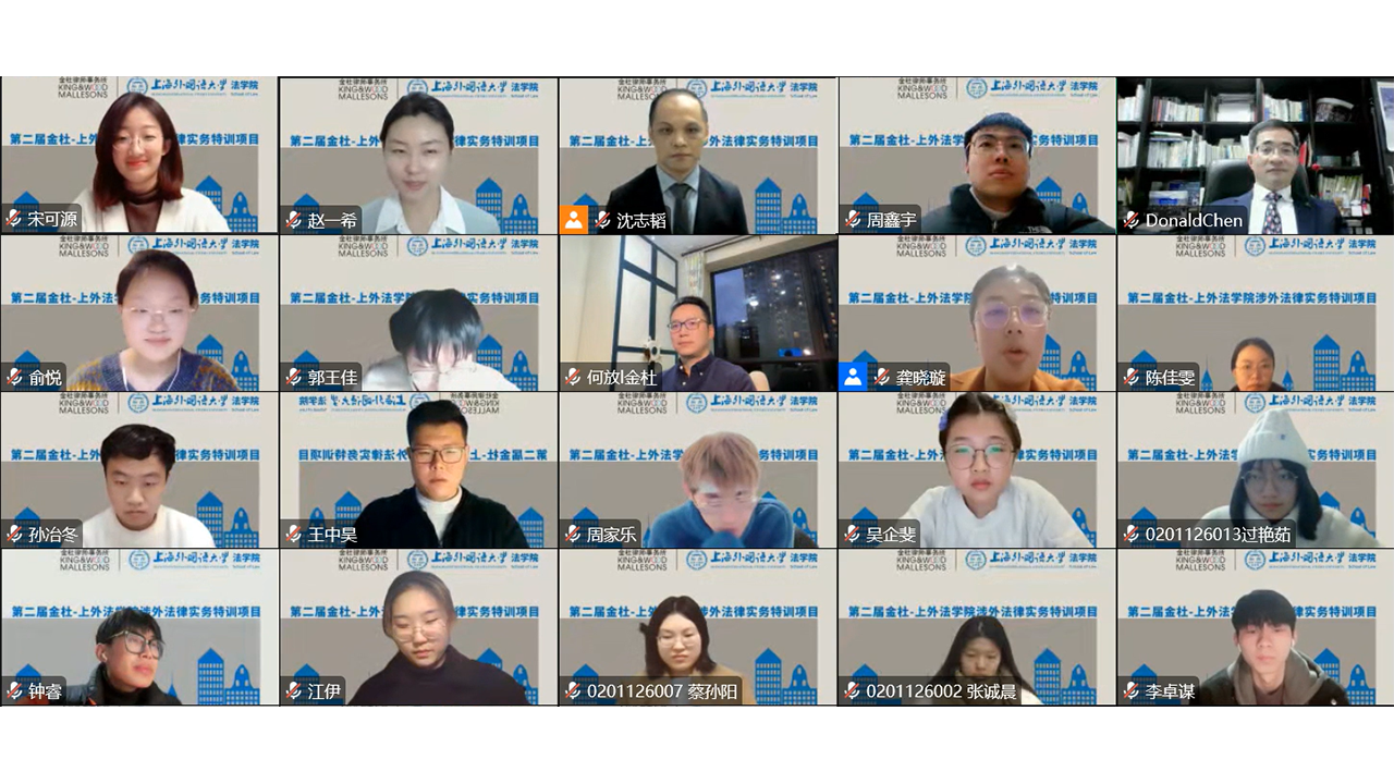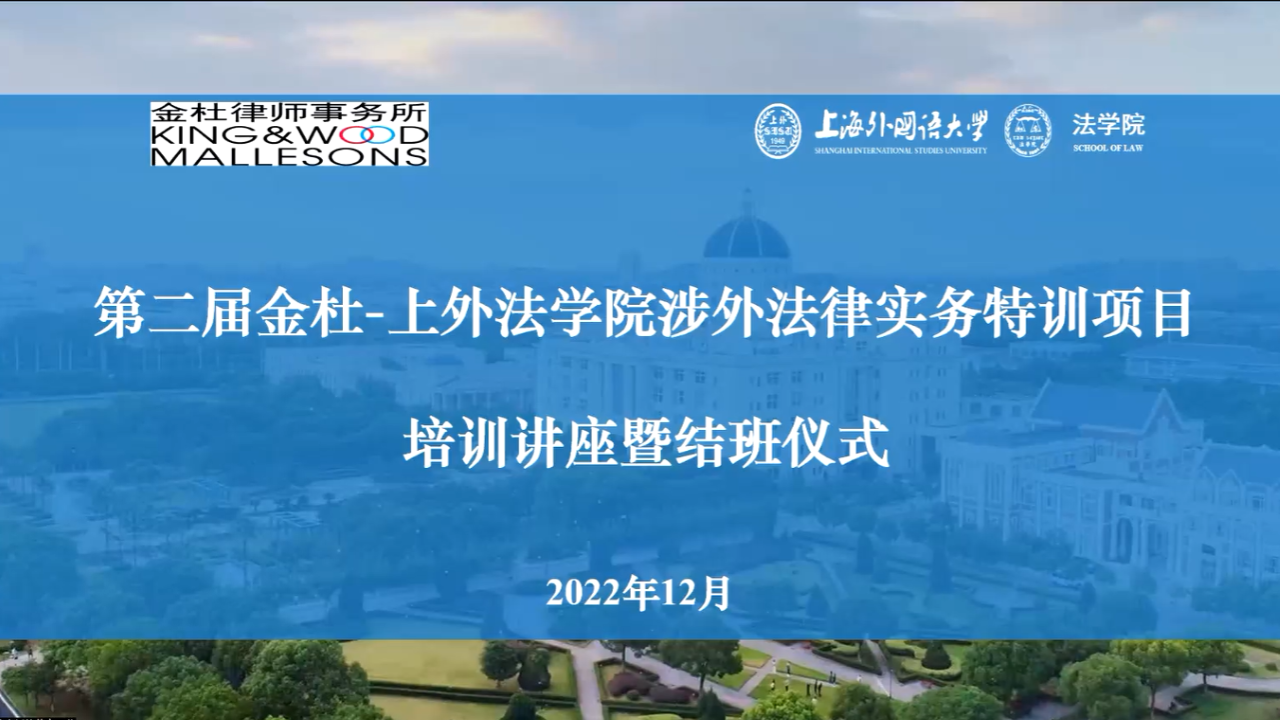 2022年11月16日,第二届金杜-上外法学院涉外法律实务特训项目培训讲座暨结班仪式在线举行,特训班学员以及本科生、研究生代表共200余人参加。法学院院长张海斌、副院长沈志韬,以及金杜律师事务所上海分所副主任陈青东、合伙人何放等出席活动。