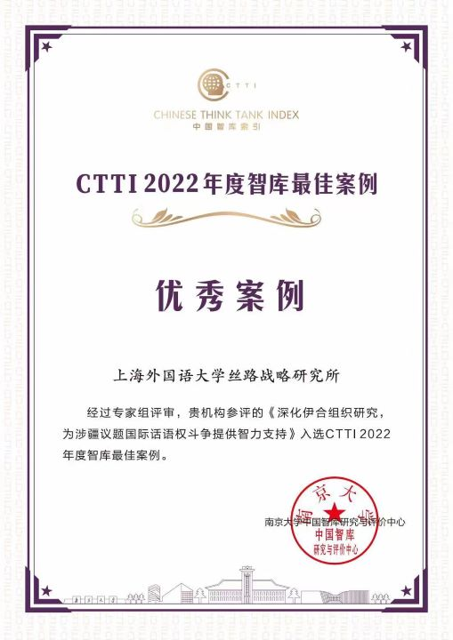 近日,南京大学中国智库研究与评价中心公布了《关于公布中国智库索引(CTTI)2022年度智库最佳案例与优秀成果推介名单》。来自372家机构参与了本次评选活动。经过工作团队初审和专家委员会终审等步骤,最终共计72份建设案例入选智库建设最佳案例推介名单。上海外国语大学丝路战略研究所参选的智库建设案例《深化伊合组织研究,为涉疆议题国际话语权斗争提供智力支持》获评CTTI2022年度智库建设优秀案例。以“学习贯彻党的二十大精神,提升新型智库资政服务能力”为使命,上外丝路所不断砥砺前行。