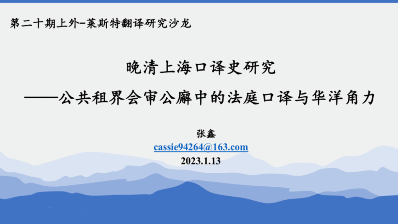 2023年1月13日下午,第二十期“上外-莱斯特翻译研究沙龙”在Microsoft Teams线上会议平台顺利举行,近30位师生参与了本次云端学术交流活动。本期沙龙的主讲人是毕业于上海外国语大学英语学院的张鑫博士,她汇报的题目为“晚清上海口译史研究——公共租界会审公廨中的法庭口译与华洋角力”。该研究旨在借助相关史料考察会审公廨中中外口译员的构成与工作表现,观察华洋官员在庭审中的样态,并以此进一步探究庭审中口译活动与华洋角力之间的交织与互动。