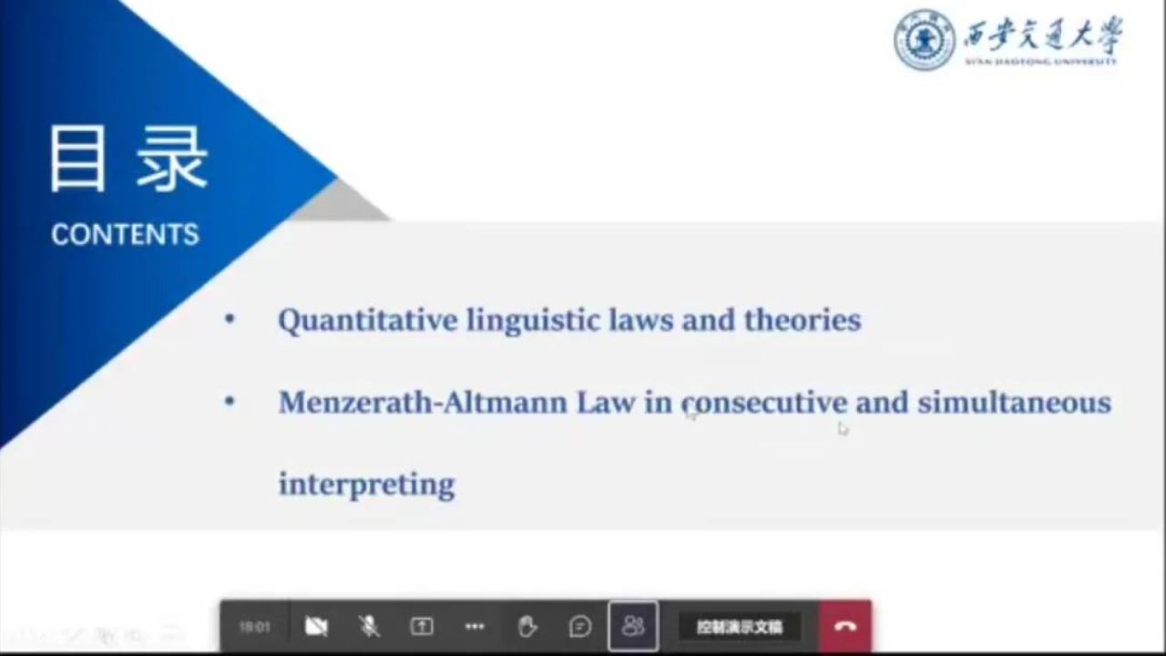 蒋新蕾博士从交叉学科视角探讨了如何采用计量语言学进行口译研究。沙龙中,蒋博士首先介绍了计量语言学的三大代表性定律,随后以其发表在Journal of Quantitative Linguistics期刊上的论文为例,具体讲述了Menzerath-Altmann 定律(MAL)与口译研究的结合和应用,探讨了作为第三语码的口译语言是否符合MAL,及同传与交传在该定律上的差异。在互动交流环节,蒋新蕾博士耐心解答听众疑惑,包括该项研究在教学中的应用、与前人研究的差异、计量语言学与翻译研究相结合的可能研究方向等问题。蒋博士特别指出,未来开展更多实验研究对现有语料库研究结果进行交叉验证具有重要意义。同时,要遵循Altmann教授所言,在不同边界条件下(boundary conditions)验证MAL,如不同的翻译语对等。