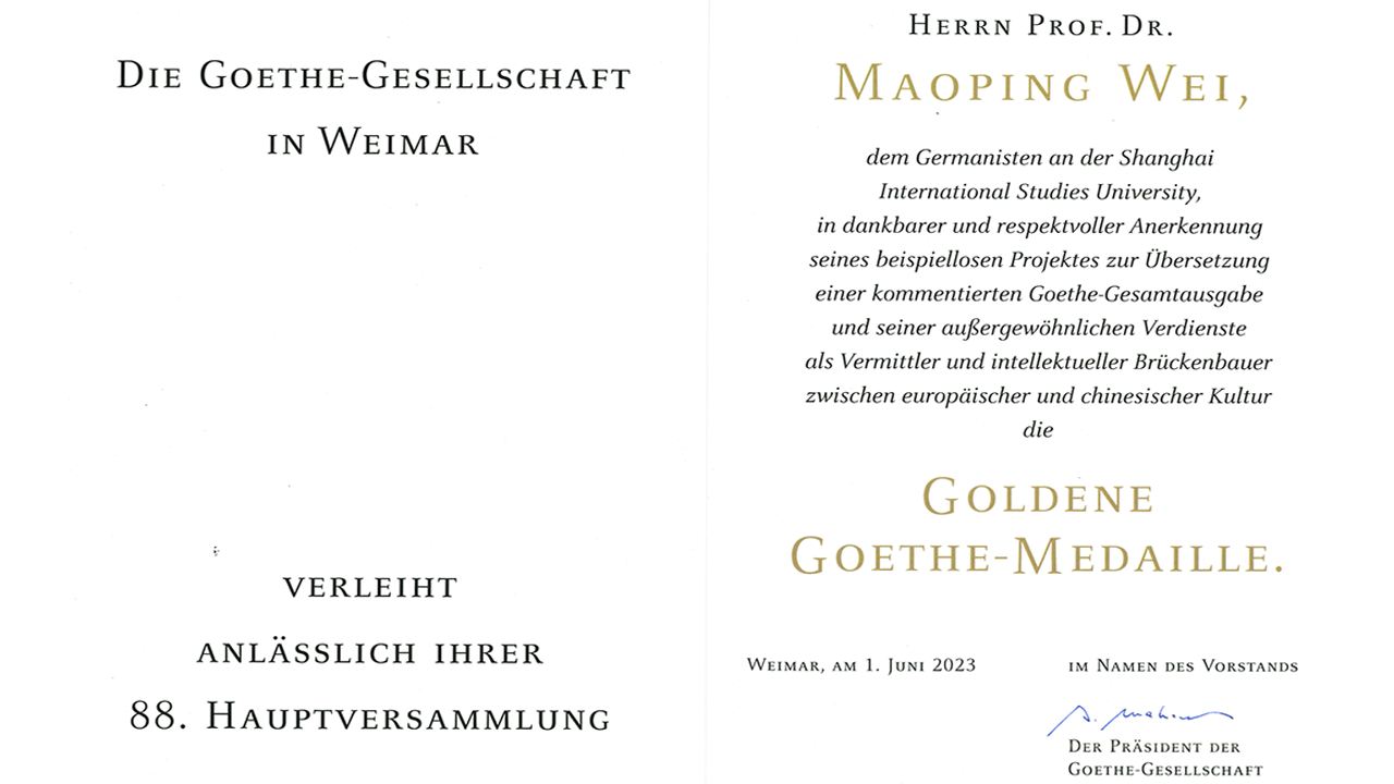 由德国魏玛歌德学会主席签署的获奖证书上写有:“魏玛歌德学会,值第88届全体会议之际,授予上海外国语大学的日耳曼学家卫茂平教授博士先生歌德金奖。”