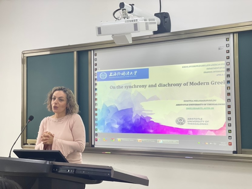 希腊语讲座的主题为《论现代希腊语的历时性和共时性》。梅丽莎洛普鲁教授首先从历时角度详细介绍了希腊语言的历史发展演变,深入探讨古希腊语、拜占庭希腊语、中世纪希腊语和现代希腊语的差异性与共性。随后又从共时的角度,结合丰富的例证分析了现代希腊语语音的独特性,以及不同语言政策对现代希腊语形成所造成的影响。在讲座的讨论环节,同学们踊跃参与,纷纷提出在希腊语语言学习中产生的疑问和困惑,教授结合希腊语和其他欧洲语言的对比分析进行了详细的解答。