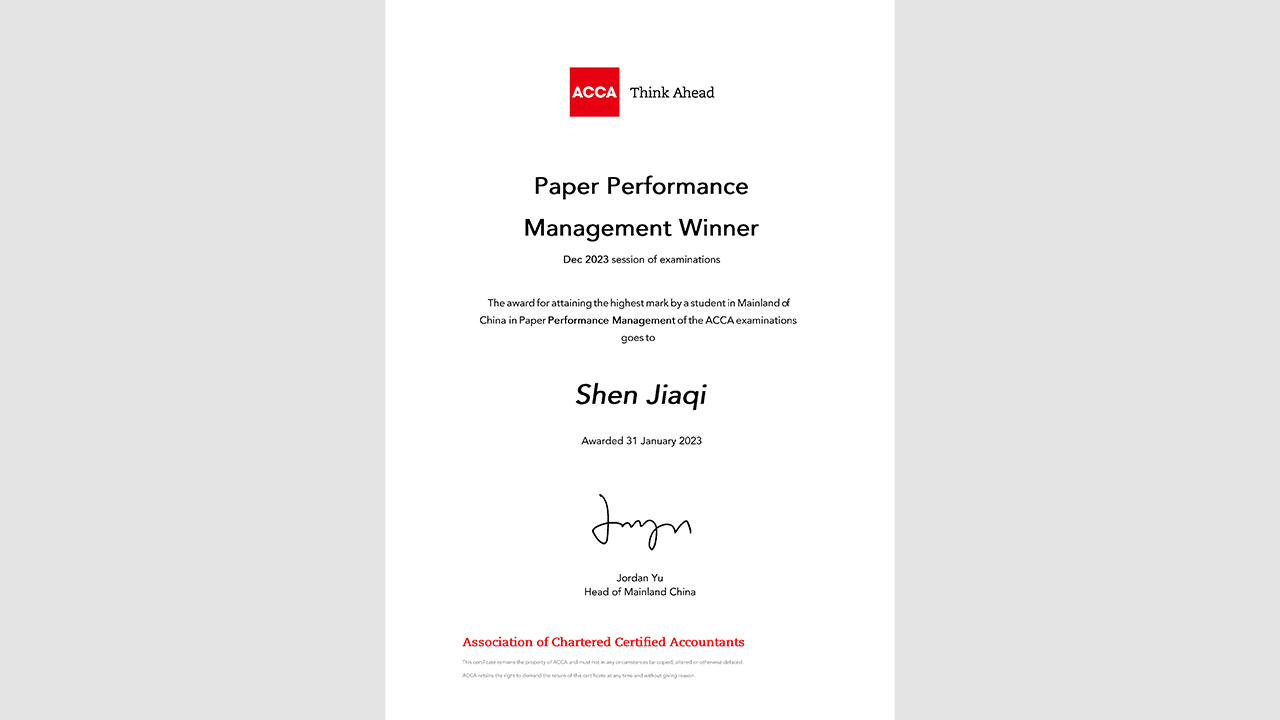 近日,英国特许公认会计师公会(ACCA)公布2023年度12月考季ACCA全球考试成绩,上海外国语大学国际金融贸易学院ACCA班学员、2022级会计学专业本科生沈嘉琪同学荣获业绩管理(Performance Management)科目“中国内地单科第一”的好成绩。