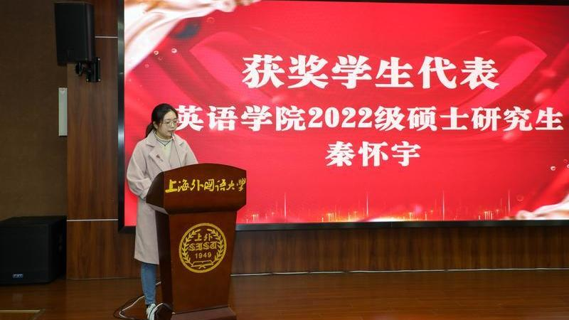 大赛特等奖获奖者之一、英语学院2022级硕士研究生秦怀宇同学作为获奖学生代表发表感言。她代表参赛学生对学校举行本次学术论文大赛表示感谢,大赛的举行为研究生群体提供了一个学术论文写作训练、科研成果展示、学术思想交流的良好平台。同时,她结合自身的学术研究经历分享了对学术论文写作初心的认识和对研究生阶段学习的认知和理解。