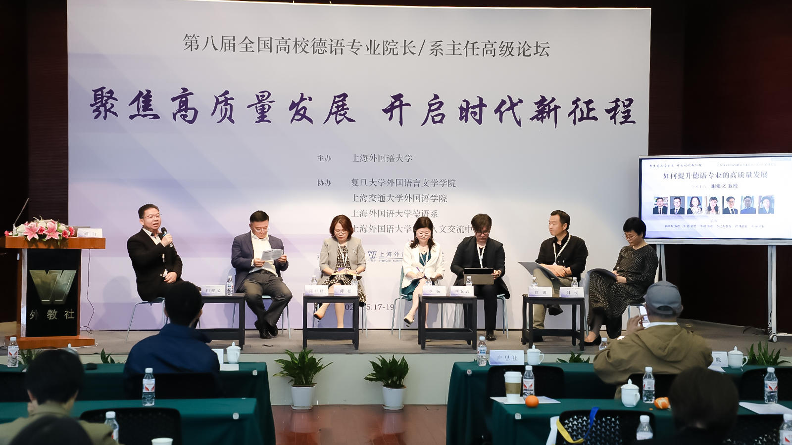 5月18日,第八届全国高校德语专业院长/系主任高级论坛在上海举办。本次论坛由上海外国语大学主办,复旦大学外国语言文学学院、上海交通大学外国语学院、上海外国语大学德语系、上海外国语大学中德人文交流中心协办,上海外语教育出版社承办。来自全国各地60余所院校(其中双一流高校26所)的近百位德语专业院长、系主任和学科负责人参加了本次论坛。